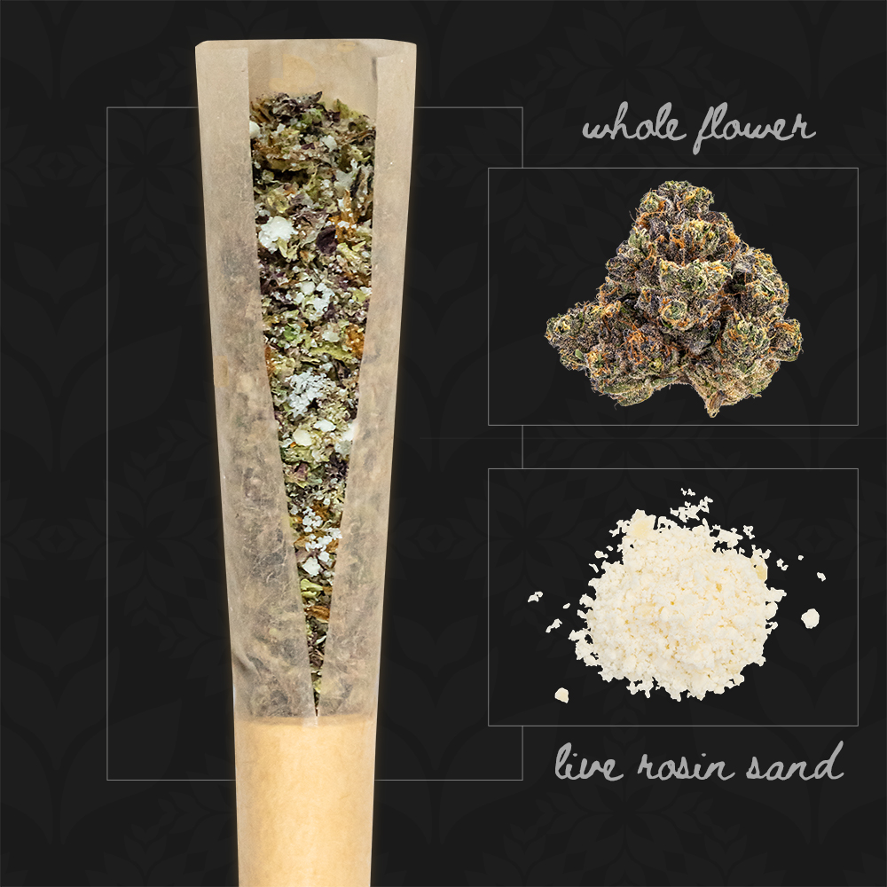 Each 2 pack of 0.5g Pre-Rolls, 1g total per container, averaging between 40-50% THC. Crafted from whole flower of a single pheno and hand-infused with first press, solventlessly-extracted Live Rosin Sand that matches the dominance of the pheno. Constructed in unbleached, rice paper cones for an even burn and maximal taste preservation. Fitted with a Dutch crown tip, you’re ready to light up a harmonious blend of solventless concentrates and sublime flower.